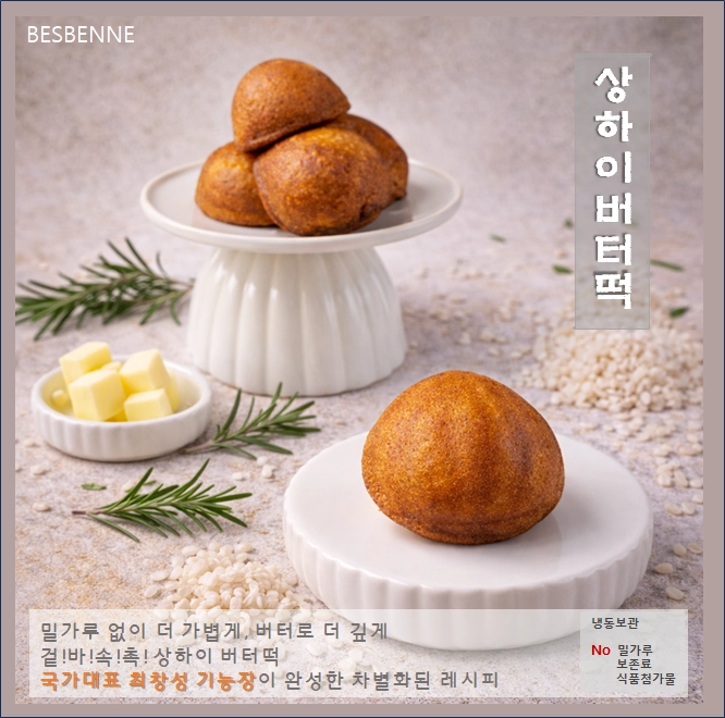 버터떡은 중국 상하이의 유명 베이커리에서 현지 MZ세대 사이에 2년 이상 검증된 디저트를 국내에 맞게 변형한 퓨전 떡 간식입니다. 찹쌀가루를 기반으로 한 반죽에 프리미엄 버터와 우유를 넣고 구워내어, 마치 까눌레와 찹쌀도넛의 중간 어딘가에 있는 독특한 식감을 자랑합니다. 마이야르 반응으로 겉은 고소하게 바삭해지고 속은 찹쌀의 수분감 덕분에 찰지고 쫀득하게 완성되는 것이 핵심입니다.